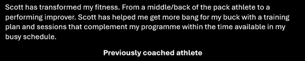I am keen to give you the focus you deserve, so I won’t be working with loads of athletes. This keeps your goals front and centre in my mind.